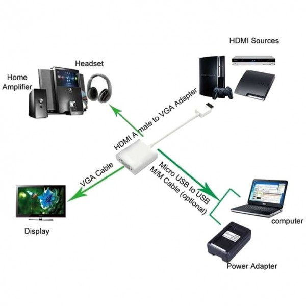 Questo adattatore converte il segnale digitale HDMI in video analogico VGA. Quando si guarda un film oppure si gioca su monitor VGA o proiettori tradizionali, questo convertitore permette non solo di godere la loro immagine ad alta definizione, ma anche di farvi godere l alta qualità del suono. Inoltre, se le sorgenti HDMI non forniscono la potenza necessaria, è possibile collegare un alimentatore o il computer alla porta Micro USB femmina e ottenere così l alimentazione desiderata.