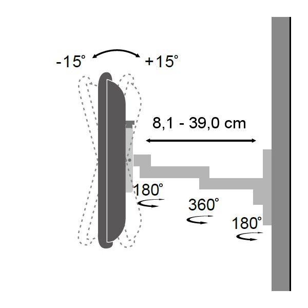 · Braccio a 3 snodi con massima estensione di 390 mm