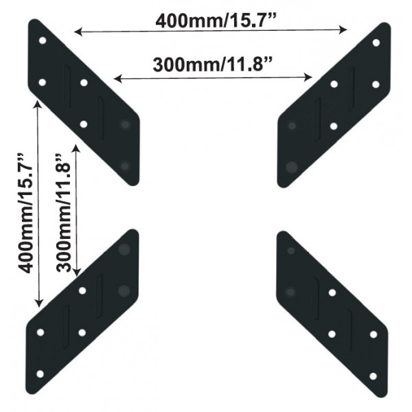 · Adattatore per staffe TV LED / LCD fisse ed estensibili · Allunga il supporto VESA presente sulla staffa · Estende la compatibilità VESA da 200x200 fino a VESA 400x400 · Materiale: acciaio laminato a freddo 2mm con copertura in plastica · Colore: nero