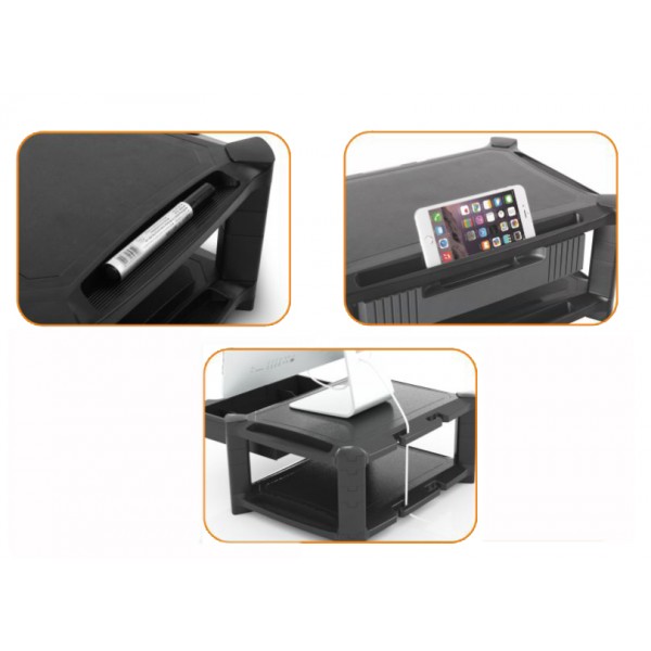 · Il ripiano regolabile permette di posizionare il monitor ad un altezza ergonomicamente corretta e di ottimizzare lo spazio disponibile sul piano di lavoro