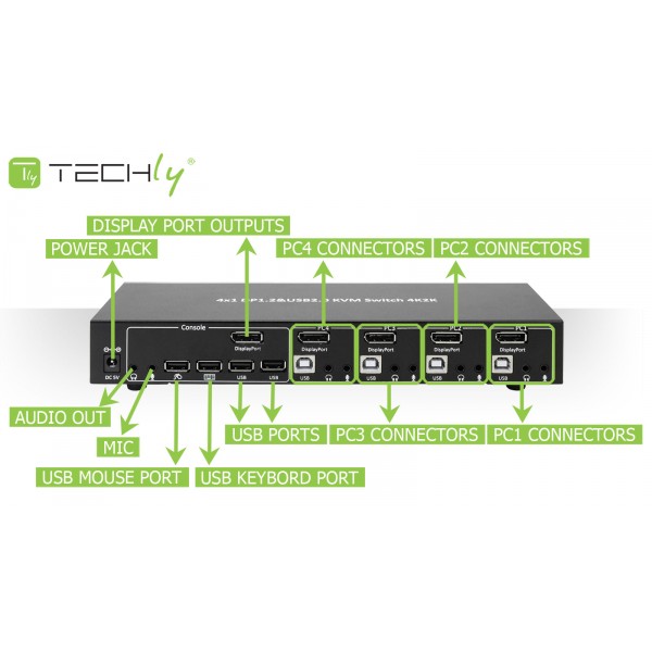 Questo 4x1 DP&USB KVM Switch permette di condividere uno schermo, una tastiera e un mouse USB con audio e microfono tra due computer DP e USB. È provvisto di due porte USB 2.0 extra con rilevamento e protezione da picchi di corrente per connettere due periferiche aggiuntive. Supporta risoluzione video fino a 3840*2160@30Hz con video link rate fino a 21.6Gbps e formati audio Dolby True HD e DTS HD Master Audio. È caratterizzato inoltre da un alloggiamento in metallo per una migliore schermatura contro le interferenze elettromagnetiche e permette all’utente di commutare la periferica utilizzando il tasto frontale di selezione o tramite tasto hotkey. É completamente compatibile con un’ampia gamma di sistemi operativi Windows e Mac.