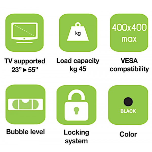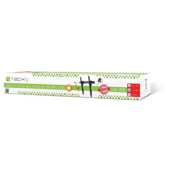 • Supporto a muro inclinabile che permette di sostenere grandi schermi fino a 55' di dimensioni e fino a 45 kg di peso• Grazie al design pieghevole, consente di contenere i costi di spedizione e di guadagnare spazio grazie alla riduzione degli ingombri• Design antifurto per garantire una maggiore sicurezza e protezione dell'apparato (lucchetto incluso)Caratteristiche• Staffa slim universale super robusta per TV 23-55' con sistema pieghevole • Supporta VESA fino a 400x400 • Massimo peso supportato: 45 kg• Permette di inclinare la posizione della televisione in modo facile e veloce• Design aperto per favorire il ricircolo dell'aria e il passaggio dei cavi • Foro per lucchetto aggiuntivo: impedisce la rimozione indesiderata per una maggiore sicurezza (lucchetto incluso)• Con sistema di sgancio rapido e manopola in acciaio per una maggiore sicurezza nel bloccaggioSpecifiche• Distanza dal muro: 37 mm• Compatibile VESA: 75x75, 100x100, 100x150, 150x100, 150x150, 200x100, 100x200, 200x200, 300x200, 300x300, 400x200, 400x300, 400x400• Indicatore di direzione per un'installazione più semplice • Inclinazione: da 0 a -12°• Con bolla di livello• Colore: neroContenuto della confezione• Supporto da muro inclinabile per TV 23-55'• Materiale di montaggio• Manuale d'istruzioni