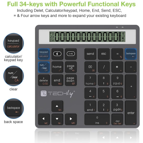 Tastierino Numerico BT V5.0 Wireless 2in1 con Calcolatrice Grigio Scuro