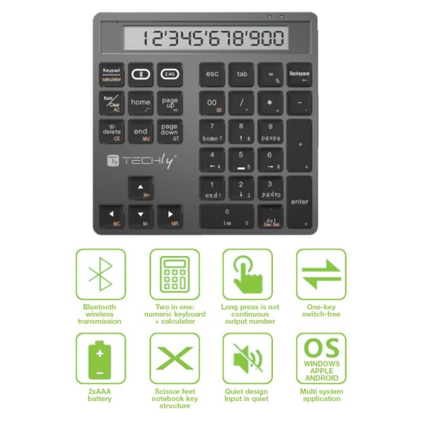 • Tastierino Numerico BT V5.0 Wireless 2in1 con Calcolatrice Grigio Scuro IDATA KB-1005CAL