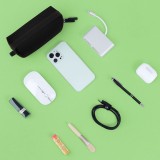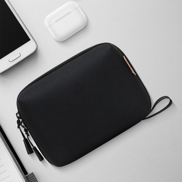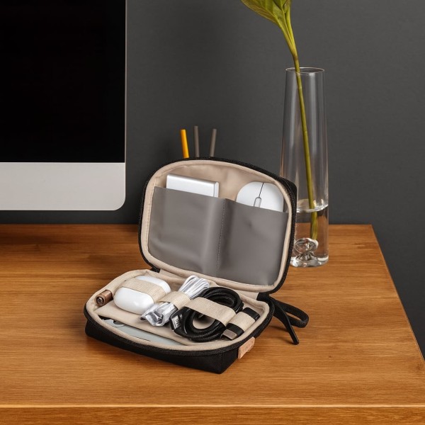 Borsa organizer piccola per cavi di ricarica e per oggetti di uso quotidiano, in ufficio, in viaggio o in movimento; ottima idea regaloPerfetta per riporre caricabatterie, cavi USB, schede SD, power bank e altro ancoraDispone di più scomparti e supporti elastici per riporre gli accessori in modo sicuro e ordinato; apertura a 180°Realizzata in poliestere resistente, è antimacchia, resistente all abrasione e idrorepellenteDimensioni (LxPxH): 18,5 x 5,5 x 13 cm; colore: nero