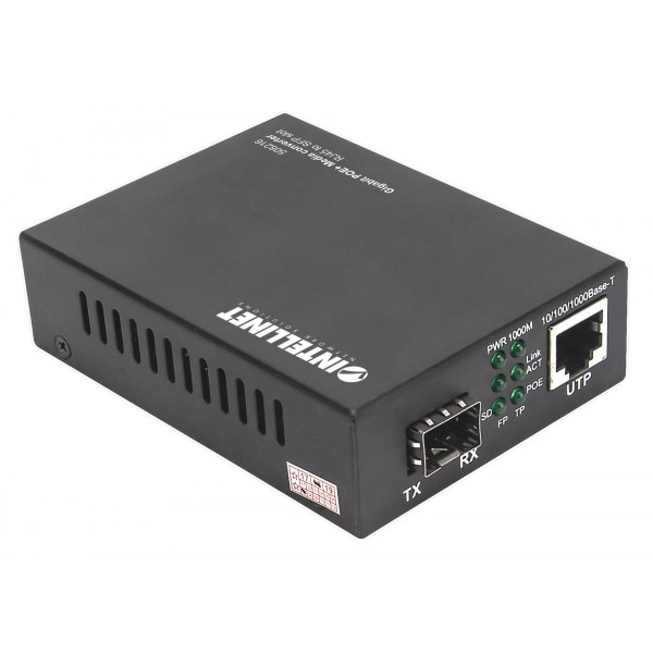 • Una porta RJ45 10/100/1000, massima distanza di 100 m• Una porta SFP per distanza fino a 120 km• Funzione Link Fault Pass Through (LFP) per semplificare la manutenzione della rete• Supporta periferiche PoE compatibili IEEE 802.3at e IEEE 802.3af (access point wireless, telefoni VoIP, IP Camera)• Supporta modalità full-duplex e half-duplex con autonegoziazione • LED di stato per alimentazione e Connessione/ trasmissione per entrambe le porte• Alloggiamento compatto in metallo IP30Standard• IEEE 802.3 / 802.3u / 802.3ab• 10/100/1000Base-T • IEEE 802.3at / 802.3af Power over Ethernet (PoE+) standard• EMC: FCC Part 15 Informazioni generali• Supporta: - 1000Base-T: Cat5 UTP/STP, max. 100 m - Slot per modulo SFP per modulo Mini GBIC (non incluso)• Connettori: - Una porta 10/100/1000 Mbps, full/half duplex, MDI/MDI-X - Una porta SFP • Piedinatura delle porte di uscita RJ45 (dati + alimentazione) - IEEE Alternativa A - Pin 1: [+] - Pin 2: [+] - Pin 3: [-] - Pin 4: inutilizzato - Pin 5: inutilizzato - Pin 6: [-] - Pin 7: inutilizzato - Pin 8: inutilizzatoLED• Alimentazione• LINK/ACT per porta RJ45• LINK/ACT per porta SFP • Indicatore PoE• LED di ingresso segnale otticoAlimentazione• Voltaggio in entrata: 56 V DC• Corrente in entrata: 0.5 AInformazioni fisiche• Chassis in metallo• Dimensioni: 95 (P) x 70 (L) x 25 (A) [mm]• Peso: 0.2 kg• Temperatura d'esercizio: 0° - 55°C• Umidità d'esercizio: 5 -80%RH, senza condensa • Temperatura di stoccaggio: -10 - 70°CContenuto della confezione• Media Converter Gigabit PoE+• Alimentatore esterno• Manuale d'uso