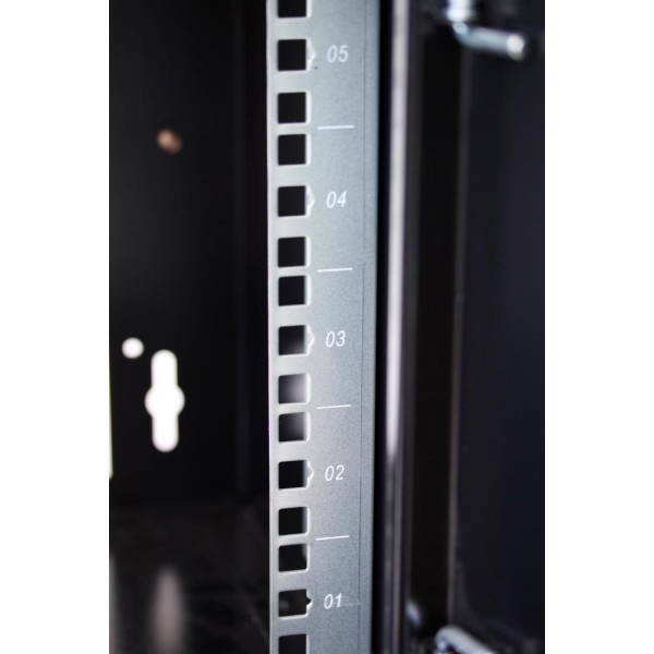 · Coppia di montanti anteriori e posteriori 19 da 1.5 mm, con unità numerate, regolabili in due posizioni (profondità utile massima 455 mm, minima 385 mm)