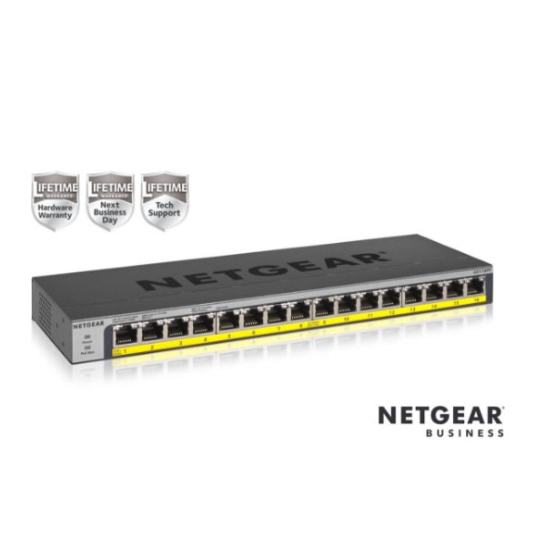 Switch Unmanaged Gigabit a 16 porte 10/100/1000Mbps tutte Poe+ - Budget PoE di default di 183W – Budget PoE flessibile tramite PSU esterni intercambiabili e selettore di potenza posto sul retro dello switch, i modelli di PSU per il GS116LP e GS116PP sono da 90W (opzionale che determina un budget PoE ridotto a 76W) e da 130W (opzionale che determina un budget PoE ridotto a 120W) e da 200W (incluso nella confezione) - Fanless - Supporto di Jumbo Frame - Formato desktop, montabile a parete e a rack con case metallico - Supporto a vita ProSafe - Alimentatore esterno - Contratto di supporto disponibile