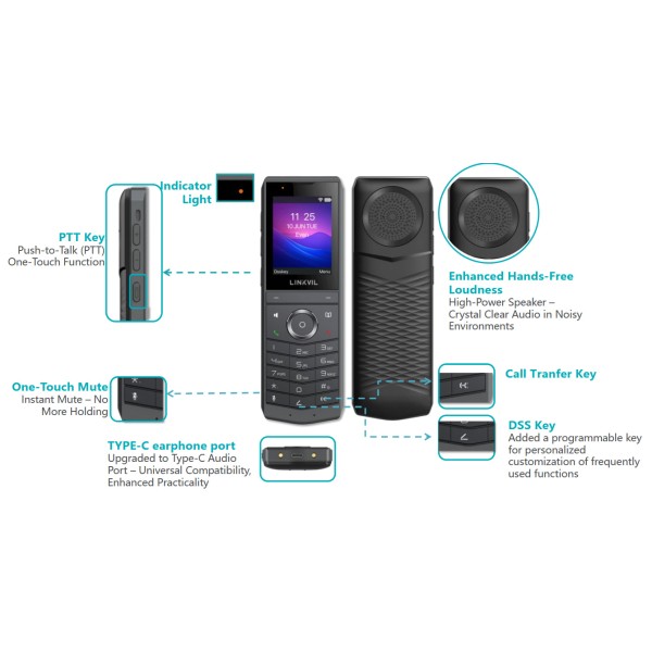 È dotato di uno schermo a colori da 2,4 pollici, pulsanti fisici, conferenza a 6 vie, video H.264 e interfono PTT.