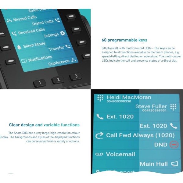 Lo Snom D8C è un modulo di espansione per tutti i dispositivi della serie D8xx. Il modulo di espansione è dotato di un ampio display a colori ad alta risoluzione con un'interfaccia utente molto chiara.
