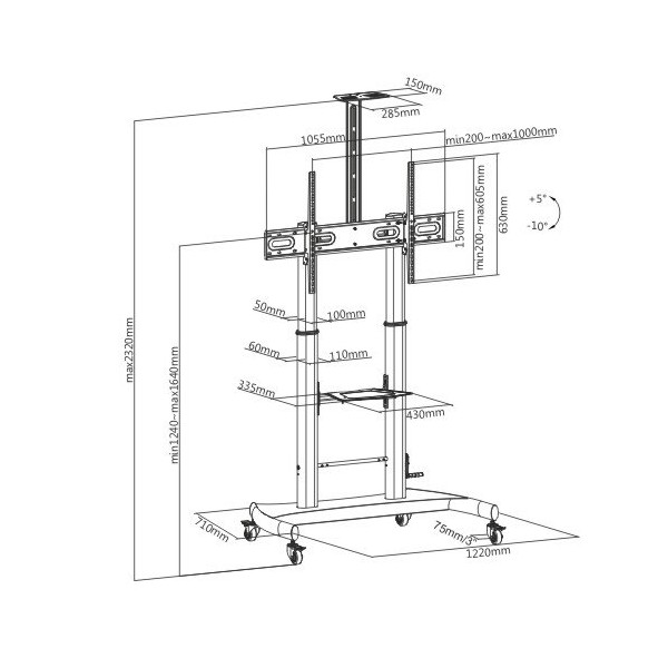 • Supporto a pavimento per TV con altezza regolabile, in acciaio, per TV da 60'' a 100''• Altezza regolabile da 1270 a 1570 mm• Massimo peso della TV supportato: 100 kg• Massimo VESA supportato: 1000x600• Base con 4 ruote per un facile spostamento• Con comoda mensola per lettore dvd o altri dispositivi/consolle da 335 x 430 mm• Massimo peso supportato dalla mensola: 5 kg• Con mensola superiore per telecamera o altri dispositivi• Massimo peso supportato dalla mensola: 5 kg• Staffa inclinabile da +5° a -10°• Facile installazione• Viti per il montaggio incluse• Colore: nero